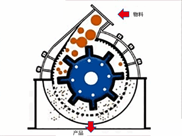 輥式破碎機工作是連續性的,石塊處在兩個平行的圓柱形相向運動的輥子之間,靠石塊與輥的摩擦力將石塊咬入輥子中,對光面輥的石塊受擠壓,對齒輥的石塊受劈裂和擠壓而破碎。主要用于煤炭、石灰石等抗壓強度 100MPa 以下中等硬度石料的中碎、細碎。