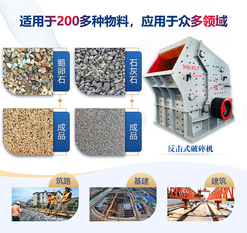 石灰石是許多工業的原料,它的生產加工離不開破碎機的破碎。對于石灰石加工,這里推薦邁斯特重工反擊式破碎機,其性能優良,工作可靠。以下從三方面介紹: