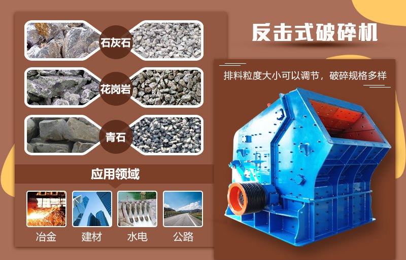 反擊式破碎機簡稱反擊破,主要可破碎各種粗、中、細料如石灰石、花崗巖、混凝土等上千種物料。用它加工出來的物料呈立方體,無張力和裂縫,粒形好、抗壓能力強。能破碎進料粒度不超過800mm,抗壓強度不超過300MPa的石料。