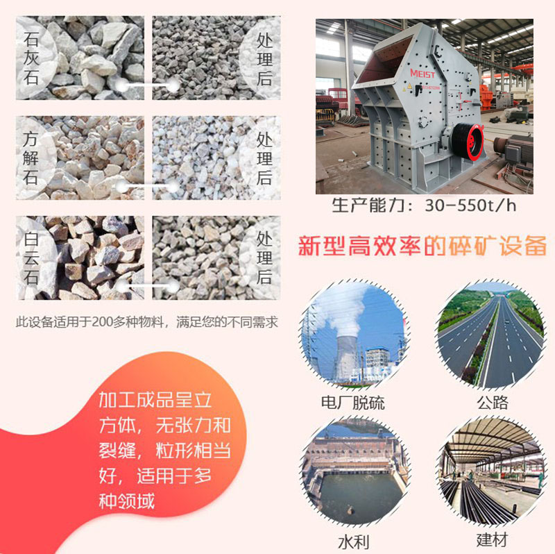 性能特點:反擊破能破碎進料粒度不超過800mm,抗壓強度不超過300MPa的石料。其排料粒度大小可以調節(jié),破碎規(guī)格多樣化。用它加工出來的物料呈立方體,無張力和裂縫,粒形好、抗壓能力強。